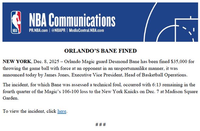 北京时间12月9日,NBA官方公布罚单,魔术后卫贝恩被罚款35000美元。NBA篮球运营执行副总裁詹姆斯-琼斯今日正式宣布,贝恩因以非体育道德行为用力将比赛用球砸向对手(阿奴诺比),被处以35000美元罚款。
